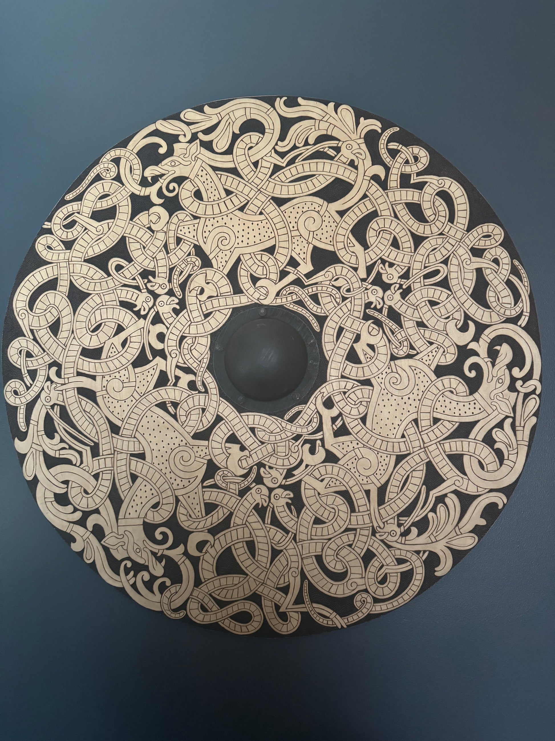This shield portrays deer fighting snakes and is from the years 900 until 975 of the viking age.