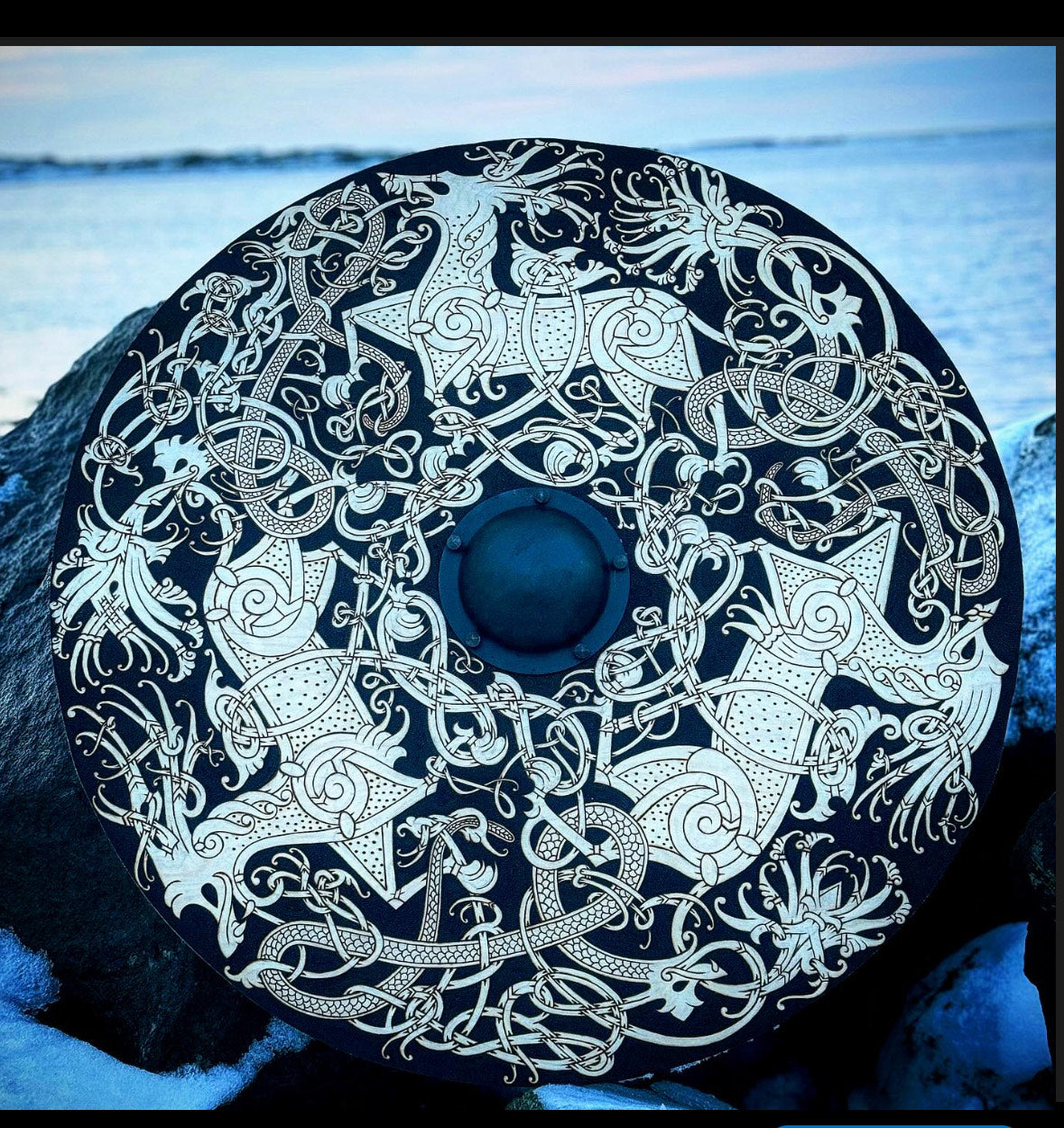 This shield is based on the Ringerike style from the years 1000 until 1075, at the end of the viking age, and portrays deer fighting dragons.