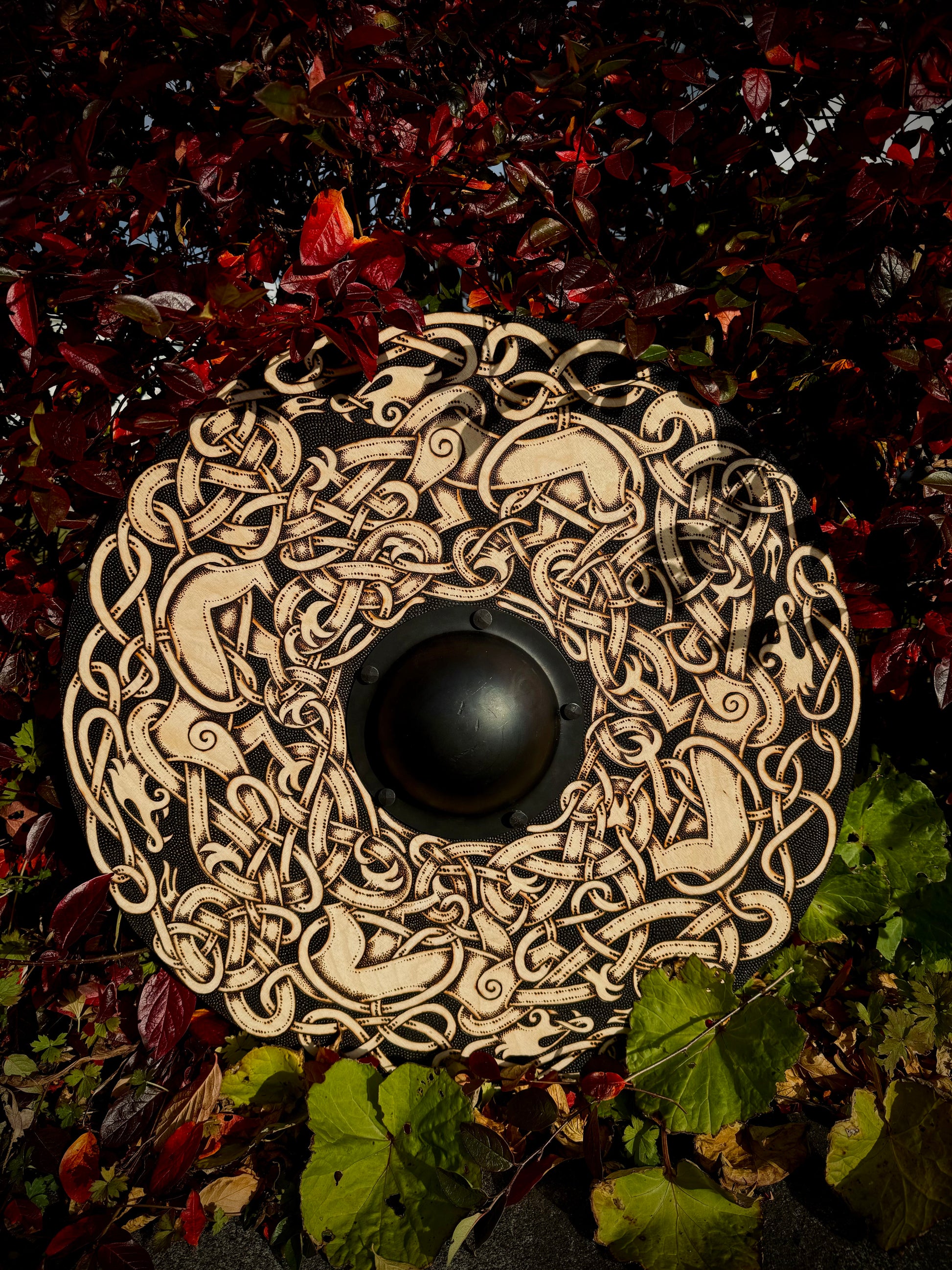 This shield portrays Wolves fighting snakes in the Urnes style from the years 1050 until 1125 at the end of the viking age.
